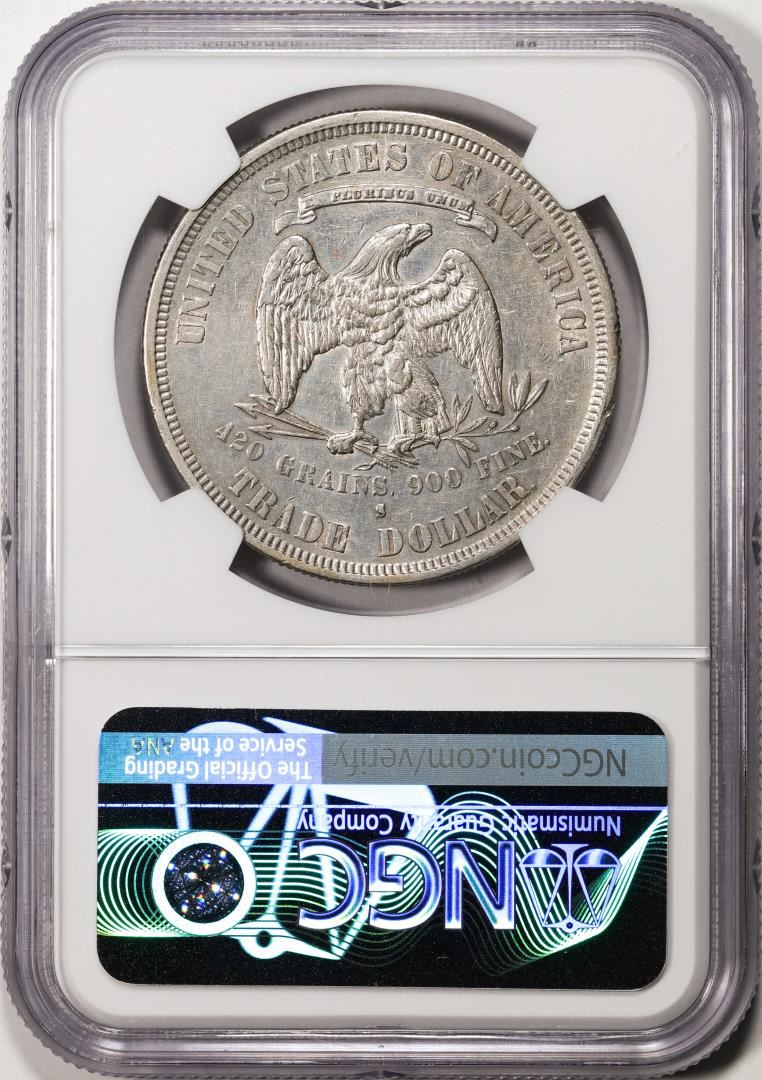 One 1877-S $1 Trade Silver Dollar Coin NGC AU Details Cleaned. NGC Certified.