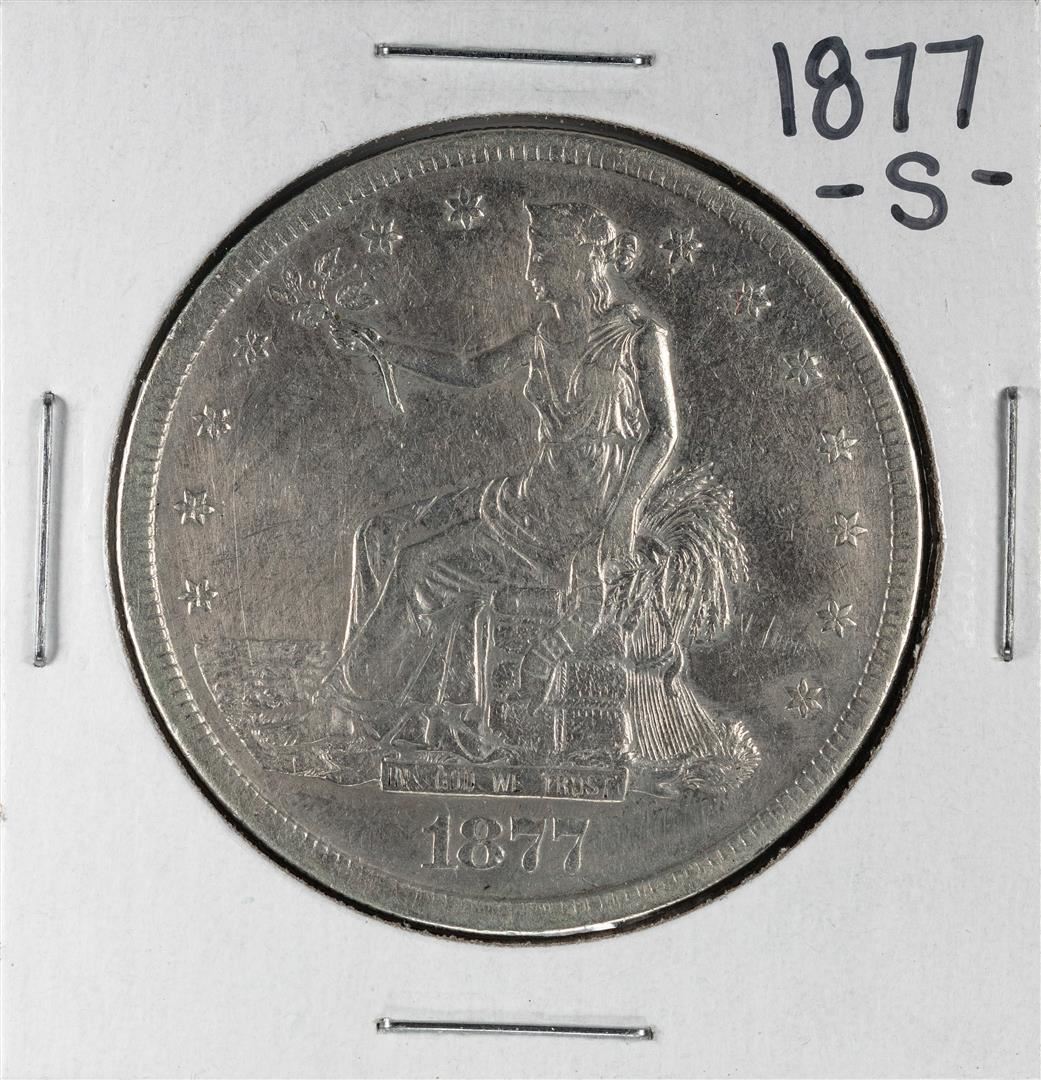 One 1877-S $1 Trade Silver Dollar Coin.