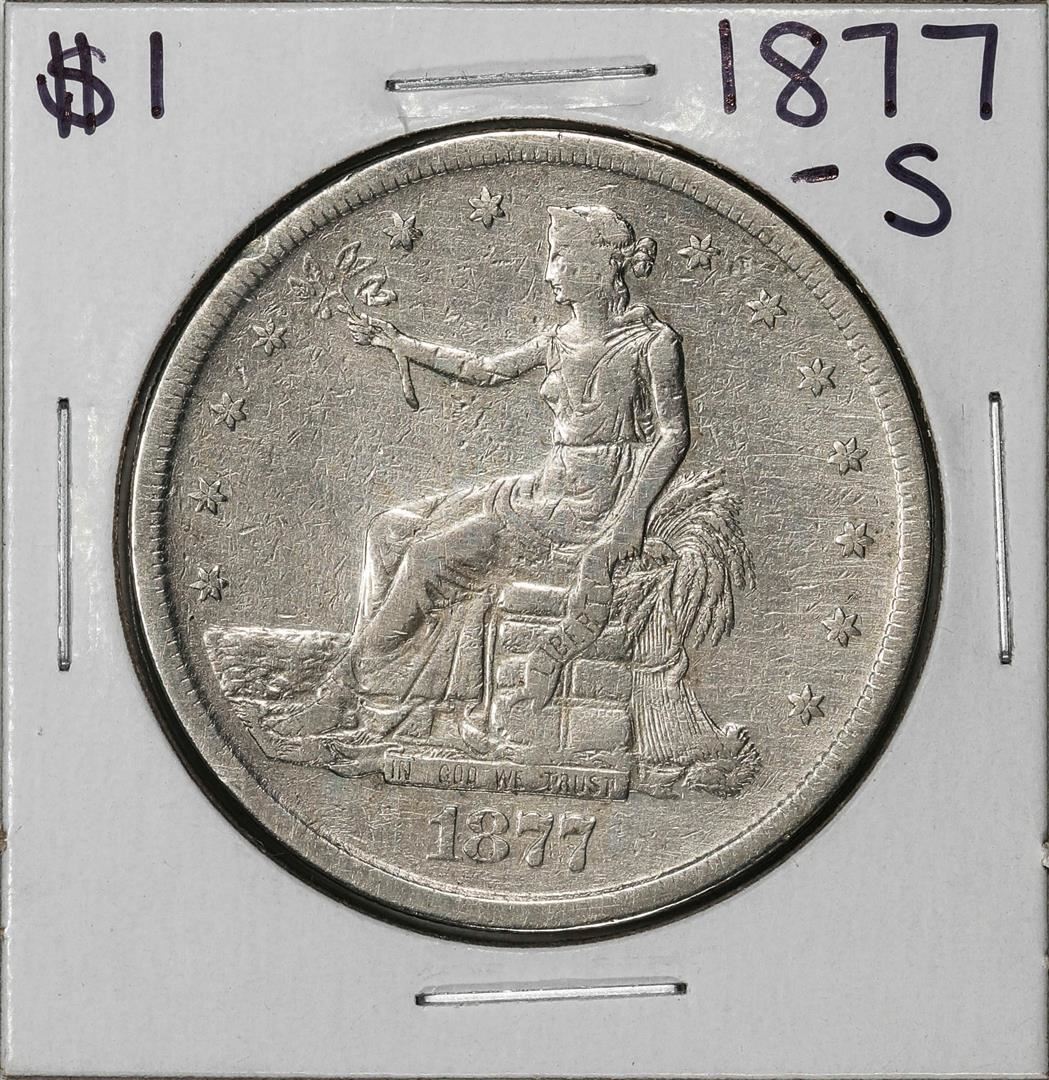 One 1877-S $1 Trade Silver Dollar Coin.