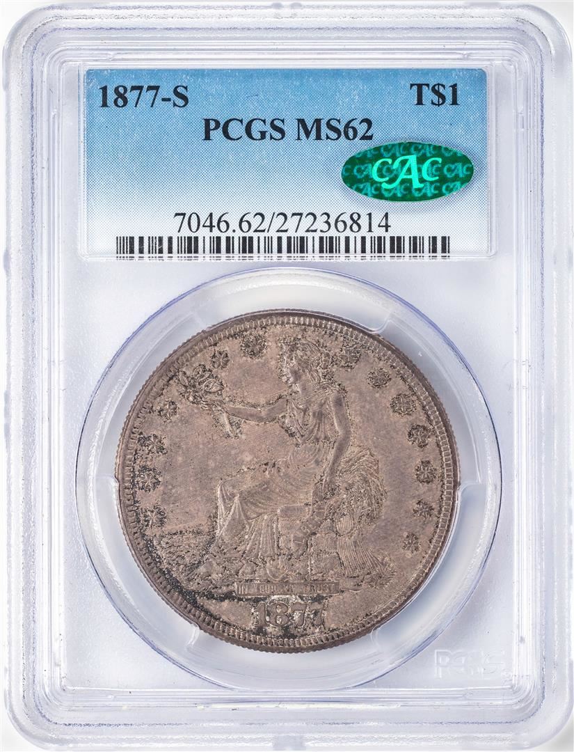 One 1877-S $1 Trade Silver Dollar Coins PCGS MS62 CAC. PCGS Graded.