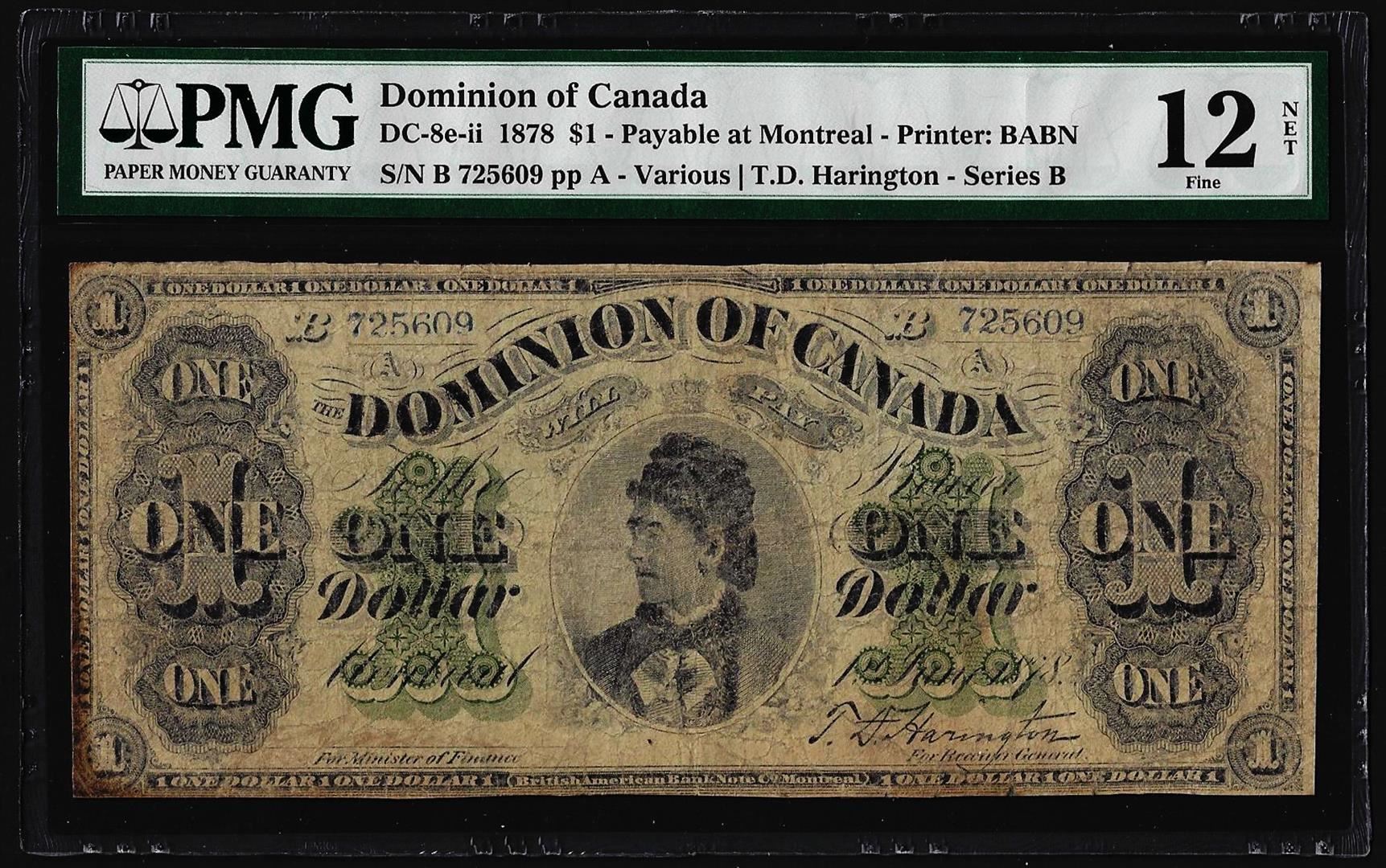 One 1878 $1 Dominion of Canada Note DC-8e-ii PMG Fine 12 Net. PMG Certified.