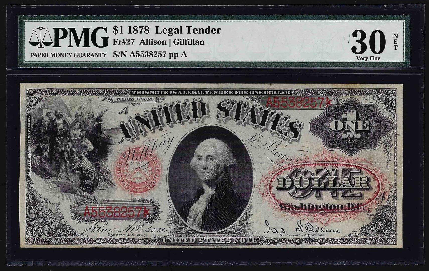 One 1878 $1 Legal Tender Note PMG VF30 Net. PMG Certified.