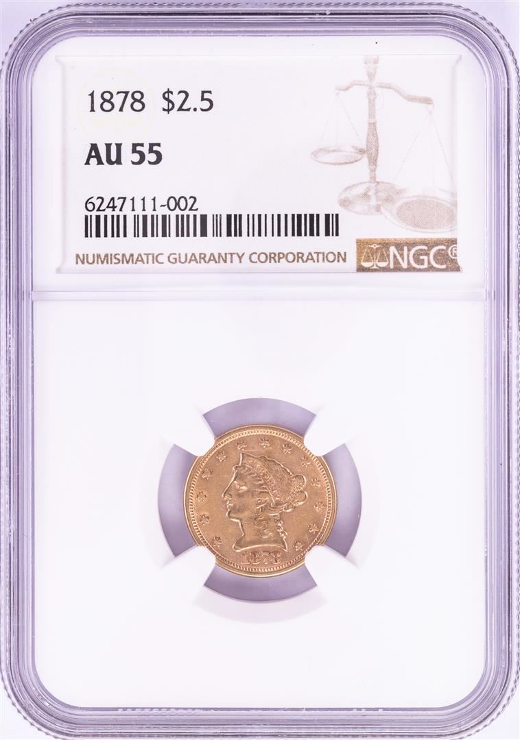 One 1878 $2 1/2 Liberty Head Quarter Eagle Gold Coin NGC AU55. NGC Certified.
