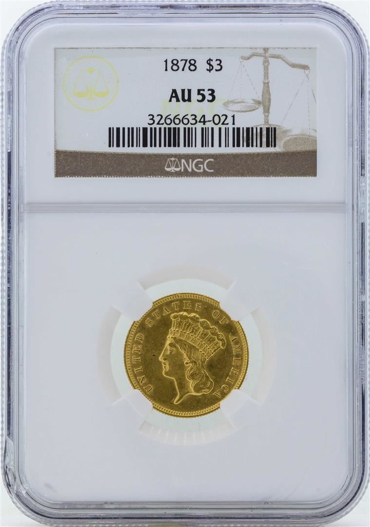 One 1878 $3 Indian Princess Head Gold Coin NGC AU53. NGC Certified.