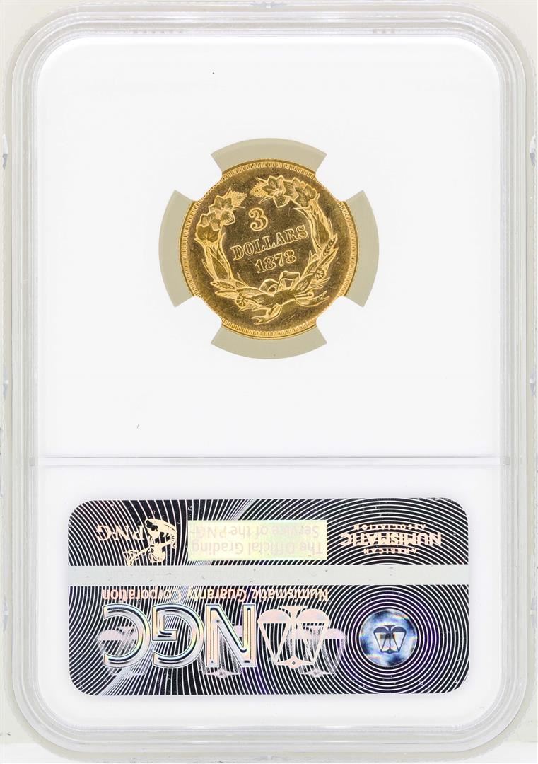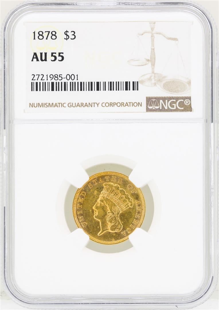 One 1878 $3 Indian Princess Head Gold Coin NGC AU55. NGC Certified.