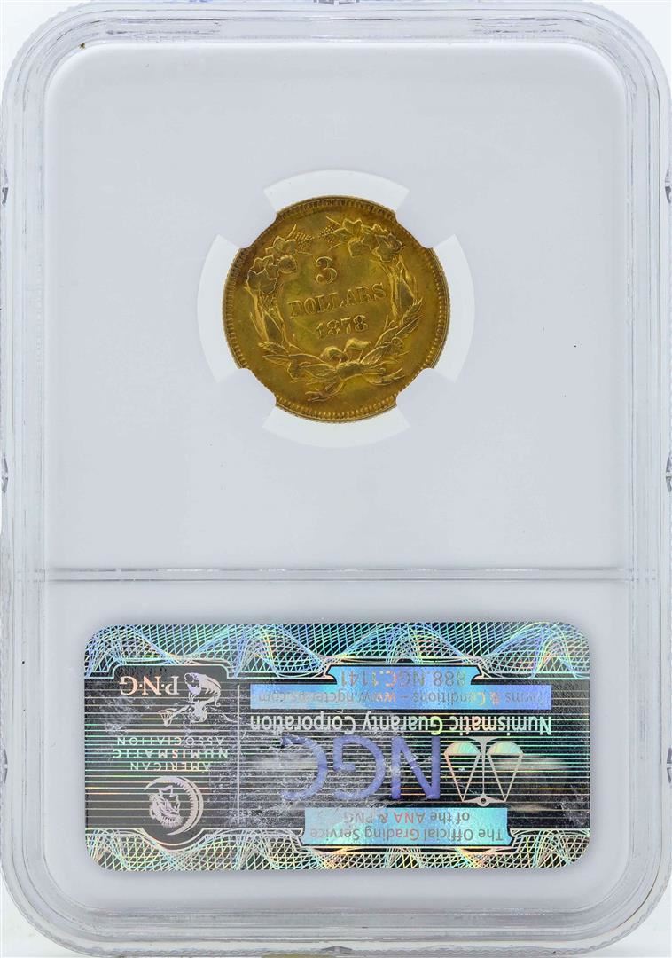 One 1878 $3 Indian Princess Head Gold Coin NGC AU58. NGC Certified.