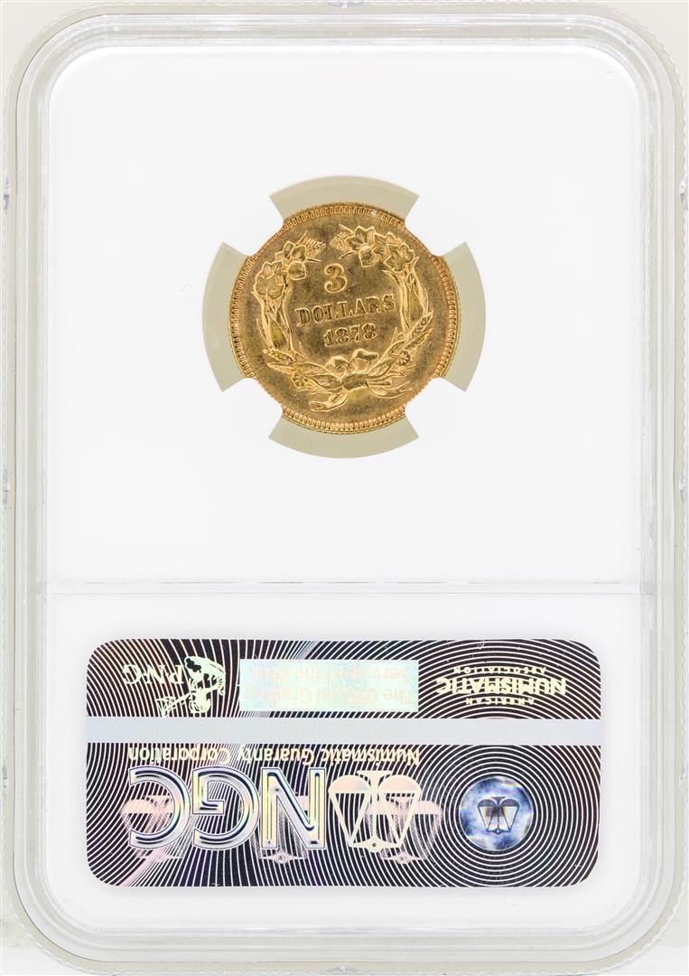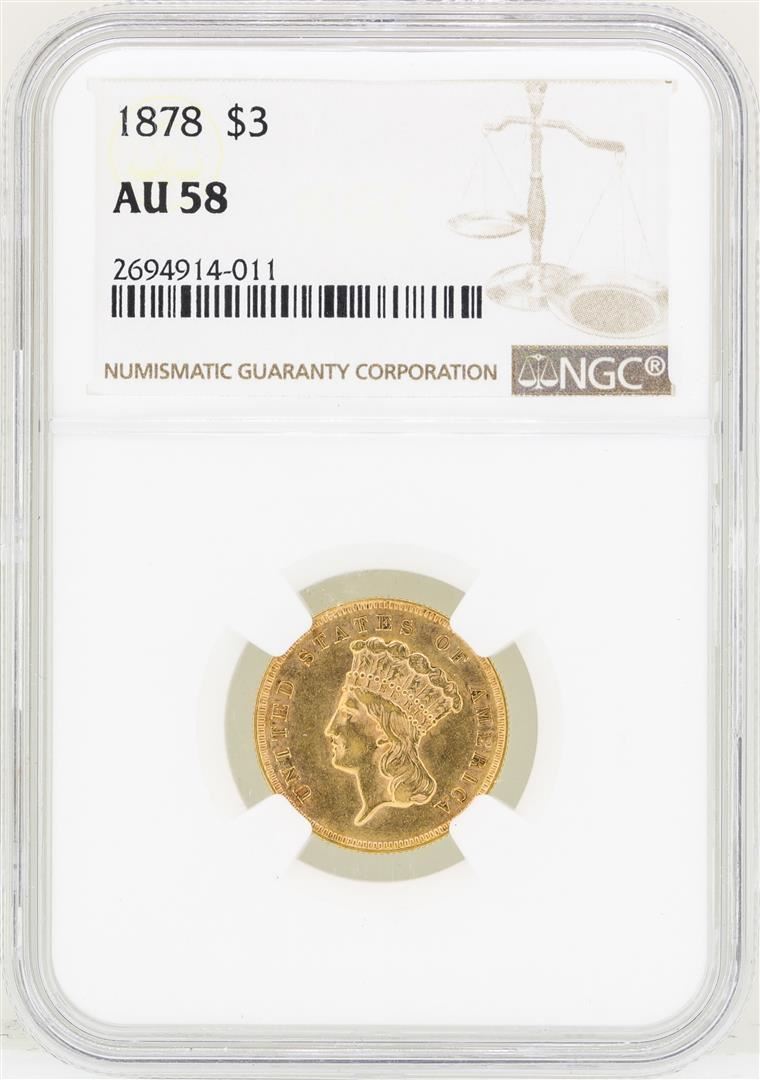 One 1878 $3 Indian Princess Head Gold Coin NGC AU58. NGC Certified.