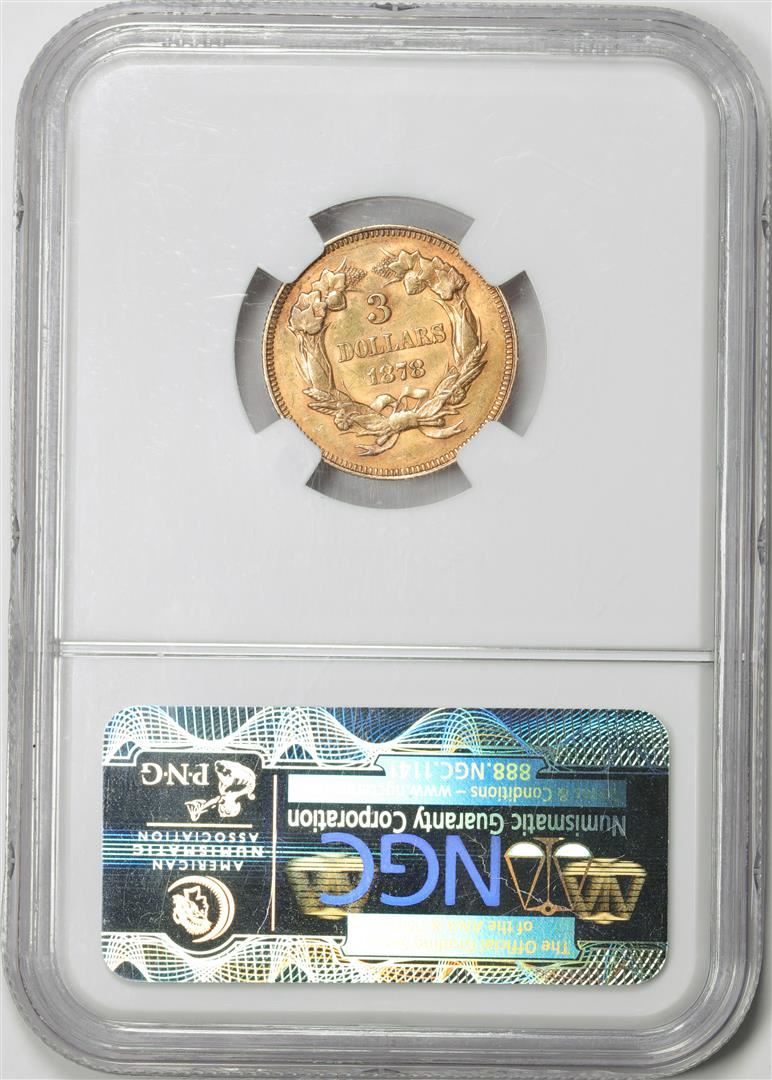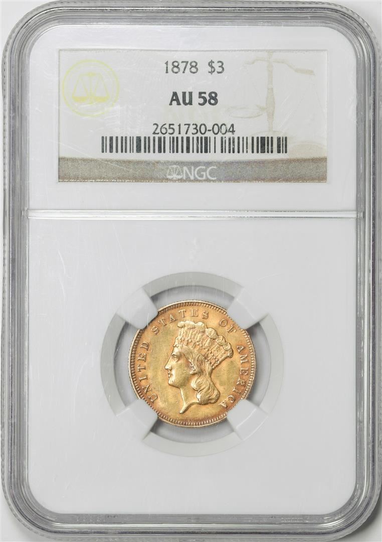 One 1878 $3 Indian Princess Head Gold Coin NGC AU58. NGC Certified.