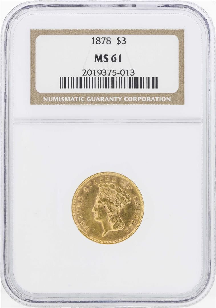 One 1878 $3 Indian Princess Head Gold Coin NGC MS61. NGC Certified.