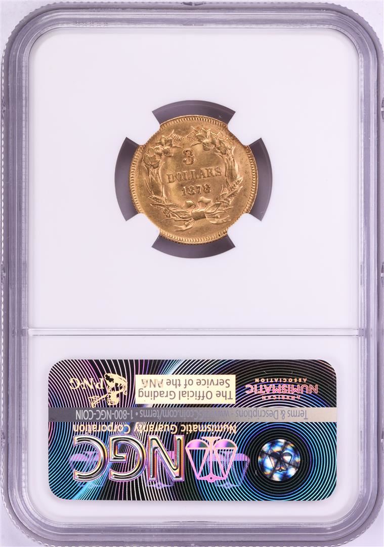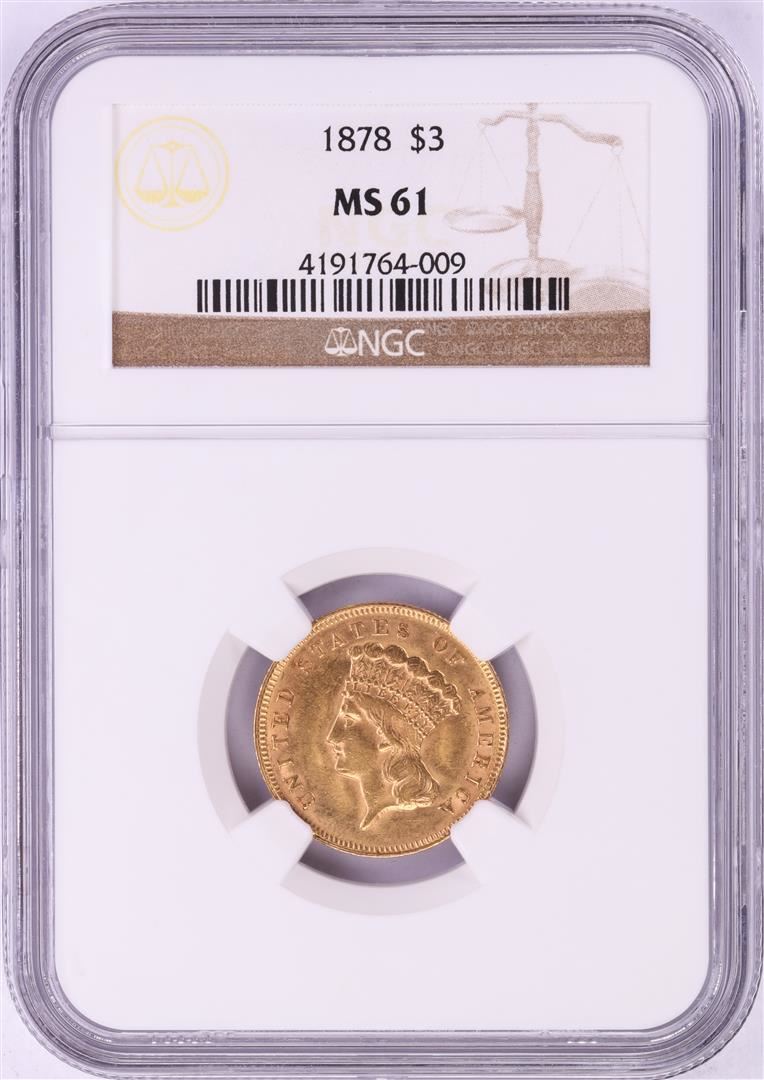 One 1878 $3 Indian Princess Head Gold Coin NGC MS61. NGC Certified.