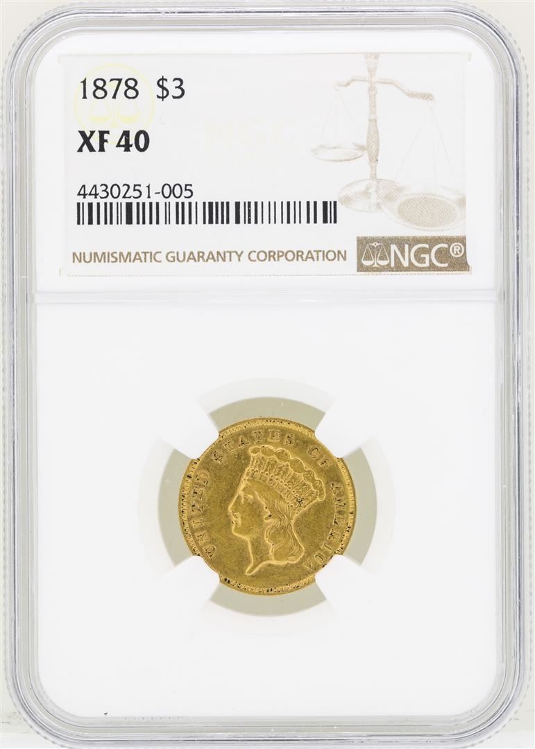 One 1878 $3 Indian Princess Head Gold Coin NGC XF40. NGC Certified.