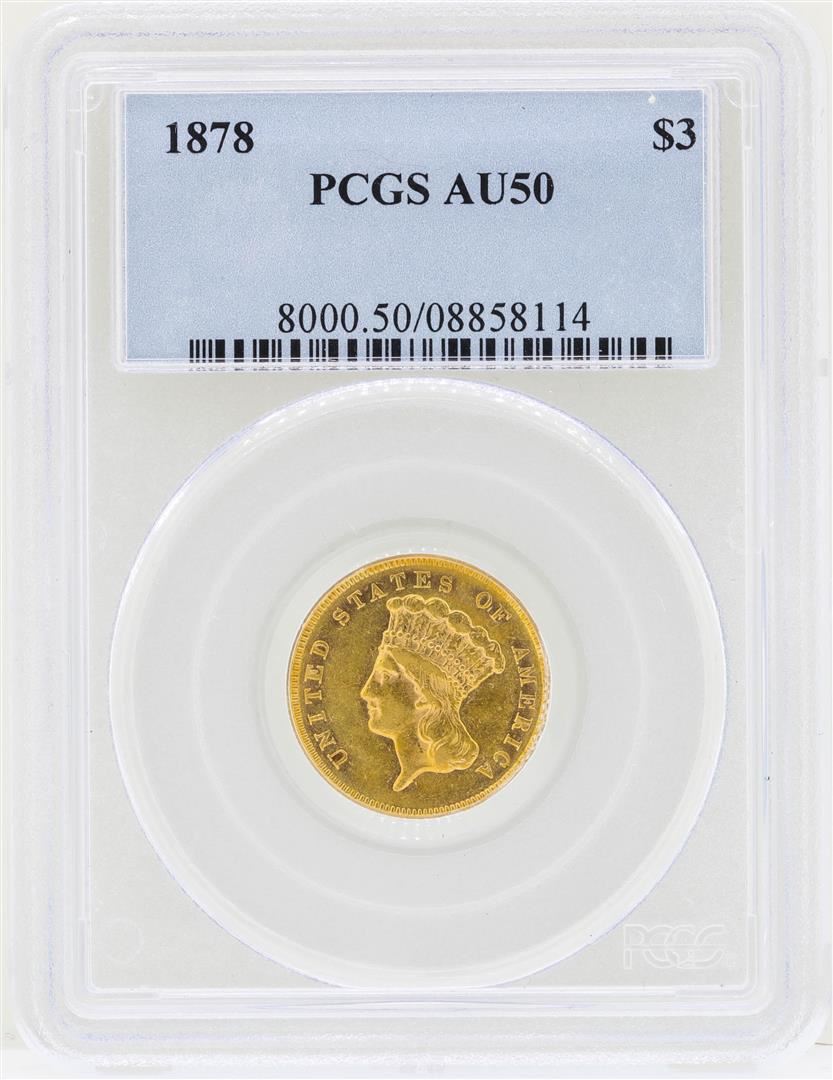One 1878 $3 Indian Princess Head Gold Coin PCGS AU50. PCGS Graded.