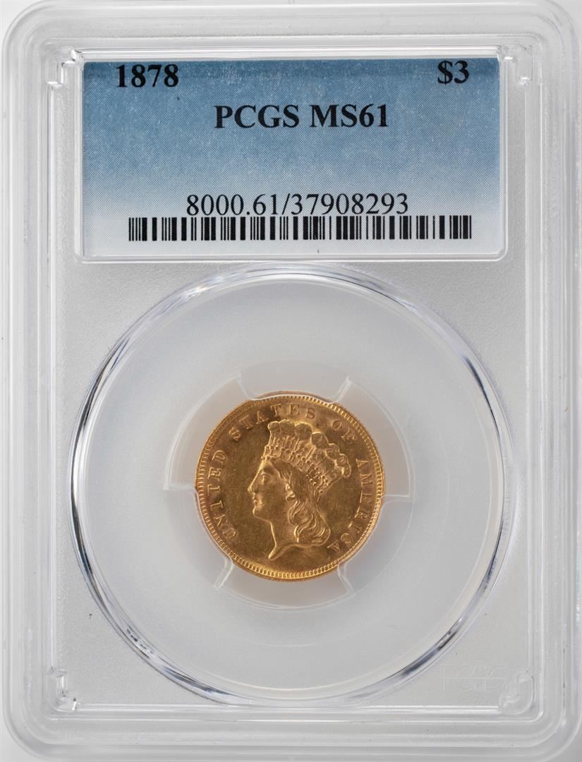 One 1878 $3 Indian Princess Head Gold Coin PCGS MS61. PCGS Graded.