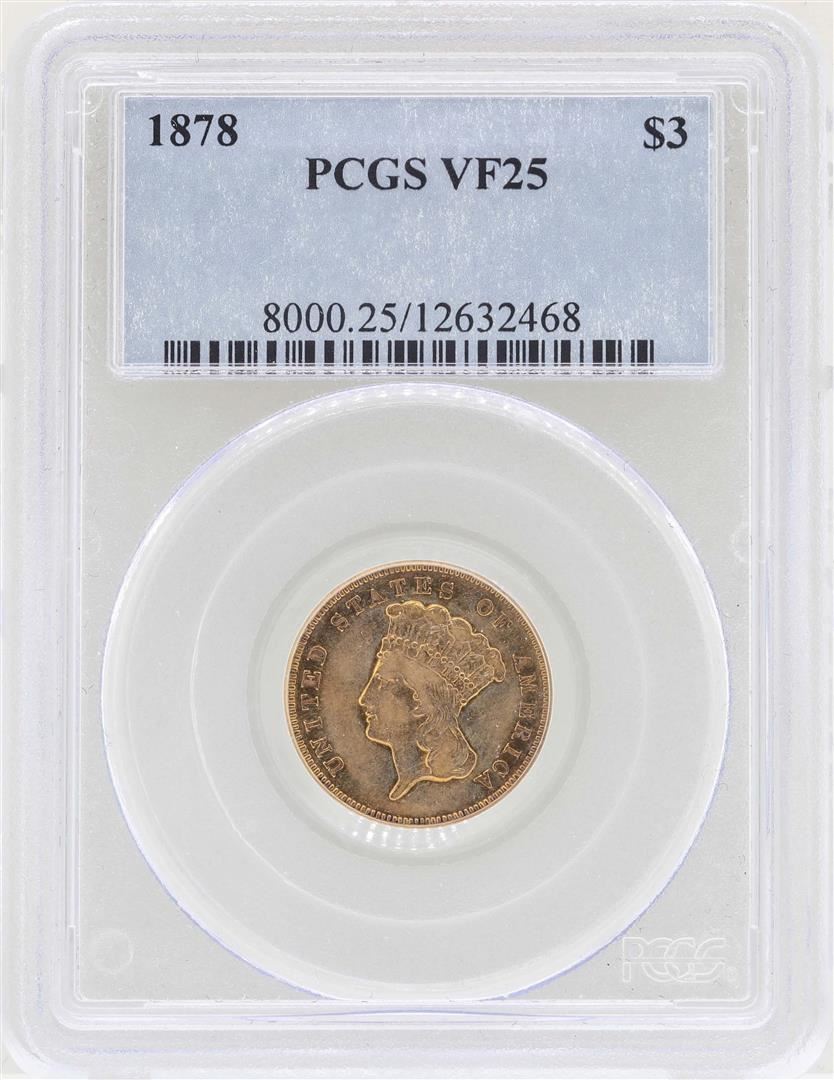 One 1878 $3 Indian Princess Head Gold Coin PCGS VF25. PCGS Graded.