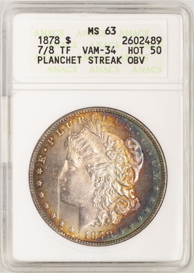 1878 7/8 TF VAM-34 $1 Morgan Silver Dollar Coin ANACS MS63 Amazing Toning