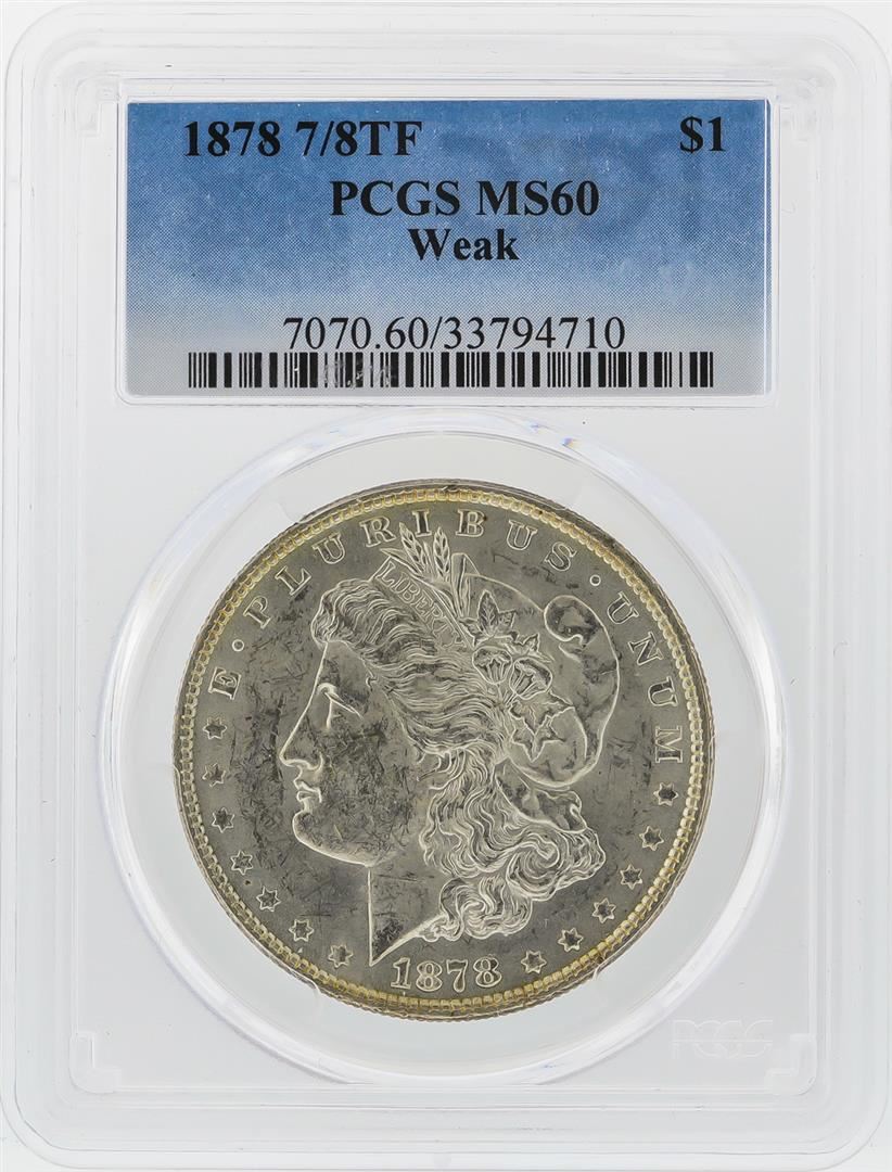 One 1878 7/8TF $1 Morgan Silver Dollar Coin PCGS Graded MS60. PCGS Graded.