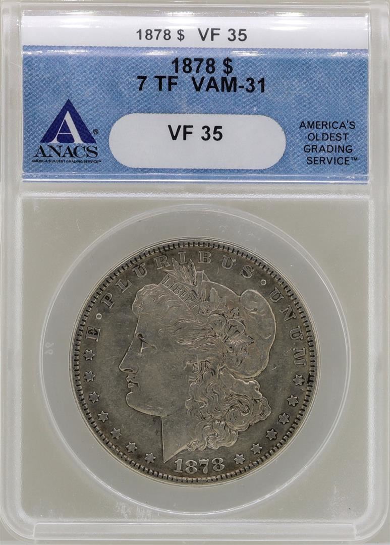 One 1878 7TF $1 Morgan Silver Dollar Coin ANACS VF35 VAM-31. ANACS Certified.
