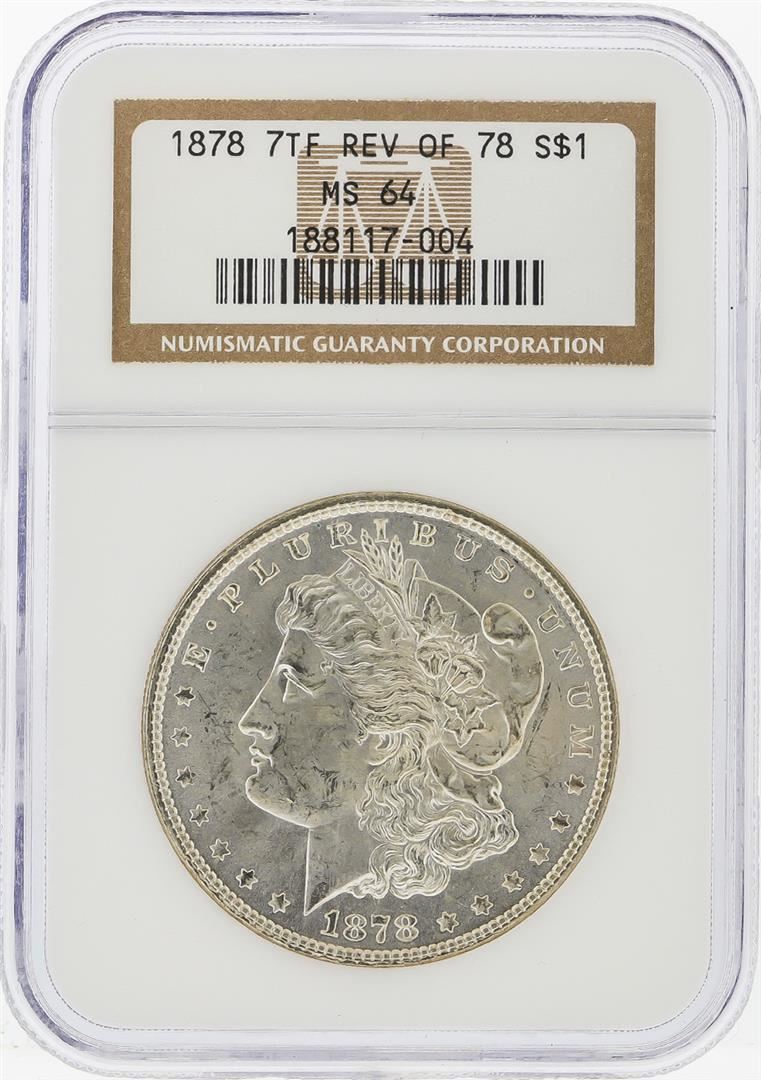 One 1878 7TF $1 Morgan Silver Dollar Coin NGC Graded MS64. NGC Certified.