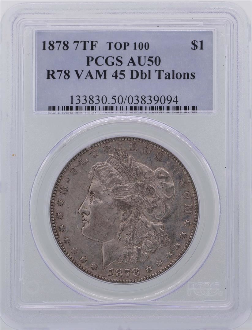 One 1878 7TF $1 Morgan Silver Dollar Coin R78 VAM-45 PCGS AU50 Top 100. PCGS Graded.