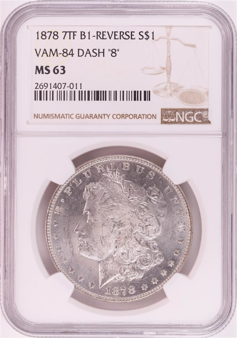 One 1878 7TF B-1 Reverse VAM-84 Dash "8" $1 Morgan Silver Dollar Coin NGC MS63. NGC Certified.