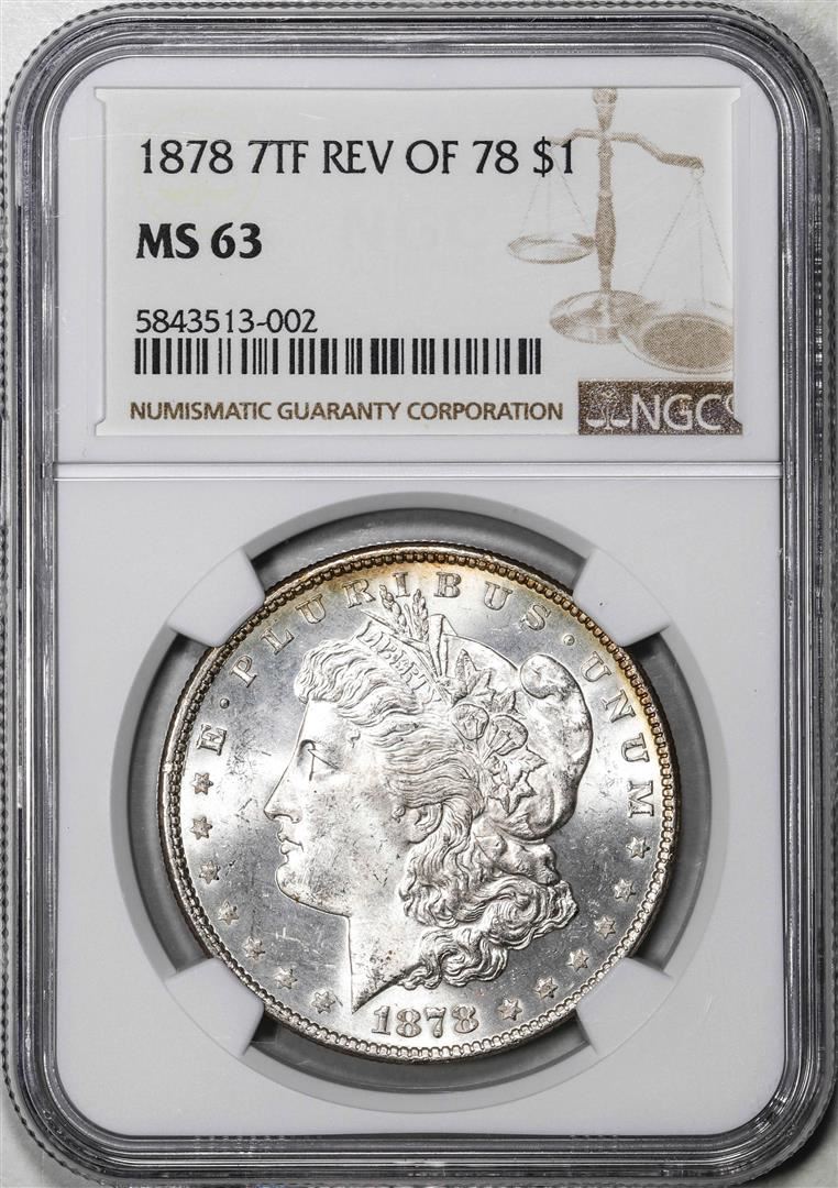 One 1878 7TF Rev of 1878 $1 Morgan Silver Dollar Coin NGC MS63. NGC Certified.