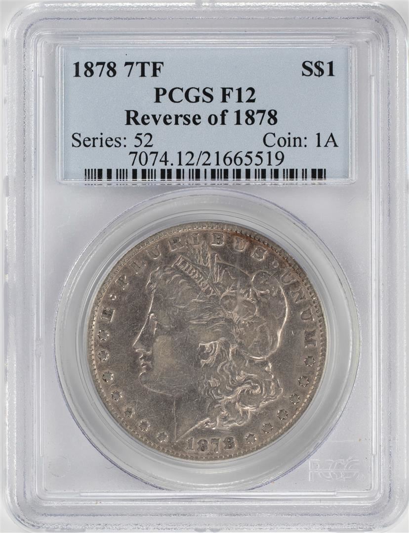 One 1878 7TF Reverse 78 $1 Morgan Silver Dollar Coin PCGS F12. PCGS Graded.