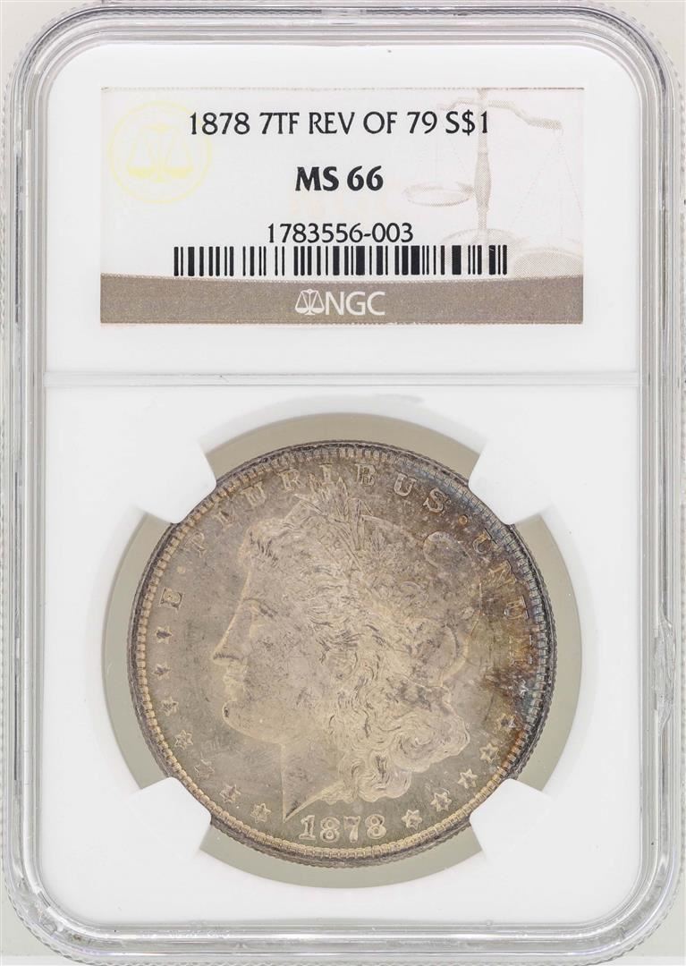 One 1878 7TF Reverse 79' $1 Morgan Silver Dollar Coin NGC MS66. NGC Certified.