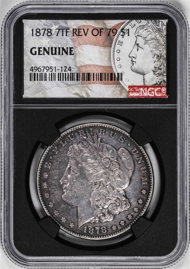 One 1878 7TF Reverse of 1879 $1 Morgan Silver Dollar Coin NGC Genuine. NGC Certified.