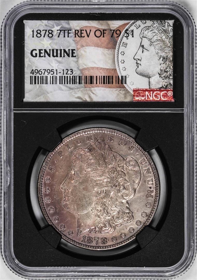 One 1878 7TF Reverse of 1879 $1 Morgan Silver Dollar Coin NGC Genuine. NGC Certified.