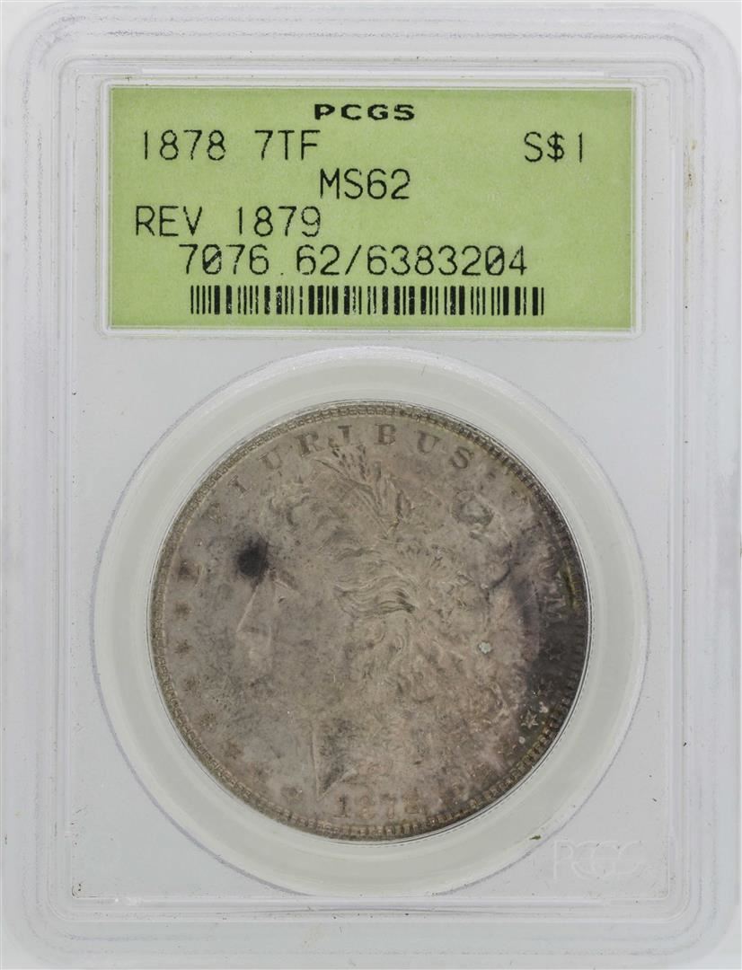 One 1878 7TF Reverse of 1879 $1 Morgan Silver Dollar Coin PCGS MS62. PCGS Graded.