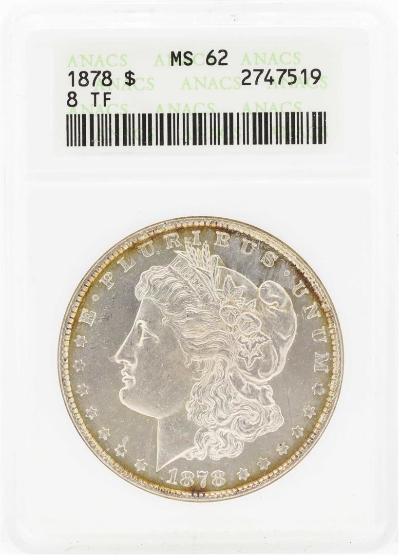 One 1878 8TF $1 Morgan Silver Dollar Coin ANACS MS62. ANACS Certified.