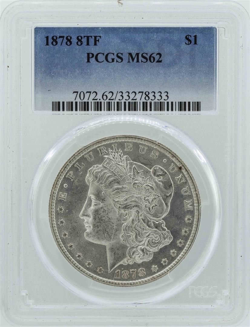 One 1878 8TF $1 Morgan Silver Dollar Coin PCGS MS62. PCGS Graded.