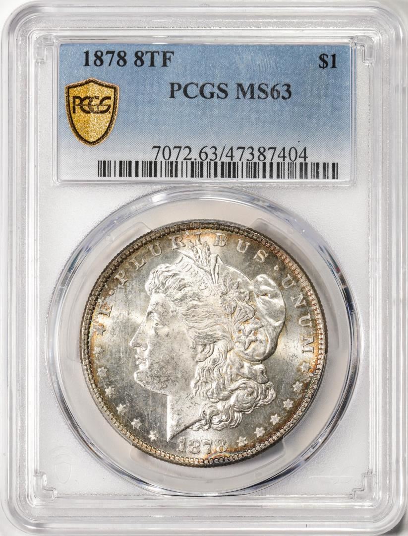 One 1878 8TF $1 Morgan Silver Dollar Coin PCGS MS63. PCGS Graded.