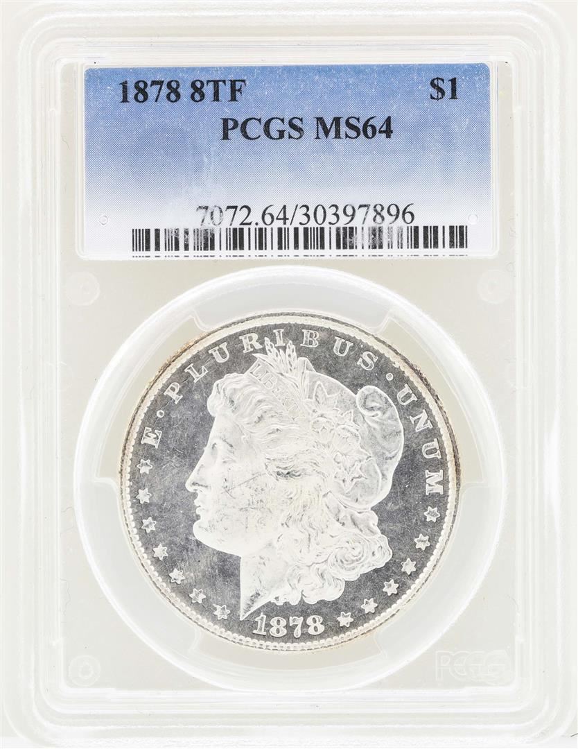 One 1878 8TF $1 Morgan Silver Dollar Coin PCGS MS64. PCGS Graded.