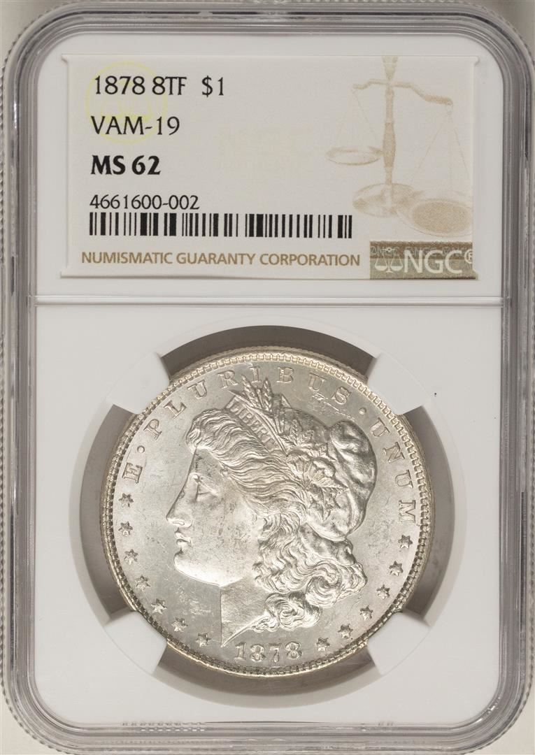 One 1878 8TF VAM-19 $1 Morgan Silver Dollar Coin NGC MS62. NGC Certified.