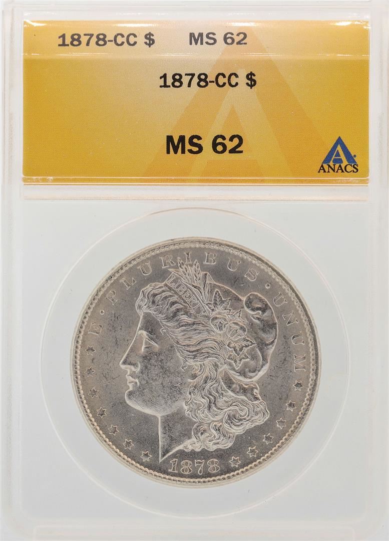 One 1878-CC $1 Morgan Silver Dollar Coin ANACS MS62. ANACS Certified.