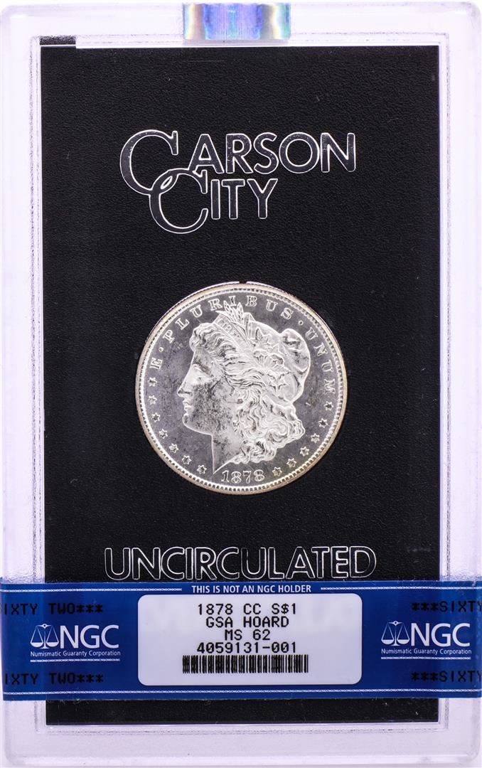 One 1878-CC $1 Morgan Silver Dollar Coin GSA Hoard NGC MS62 w/Box & COA. NGC Certified.
