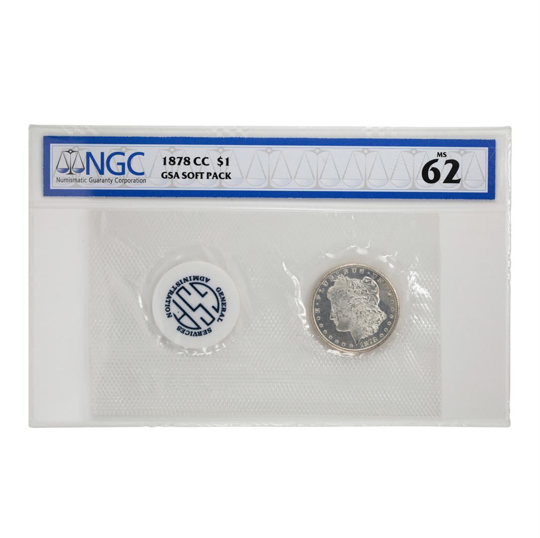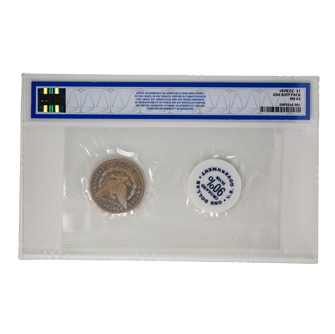 One 1878-CC $1 Morgan Silver Dollar Coin GSA Hoard Soft Pack NGC MS62 Nice Toning. NGC Certified.