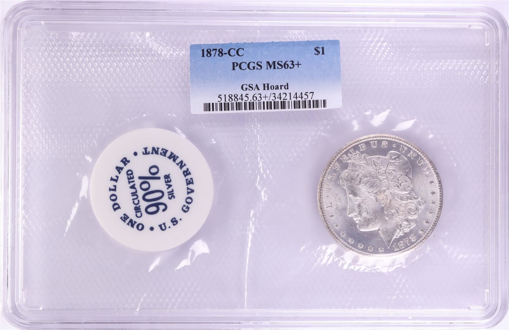 One 1878-CC $1 Morgan Silver Dollar Coin GSA Hoard Soft Pack PCGS MS63+. PCGS Graded.