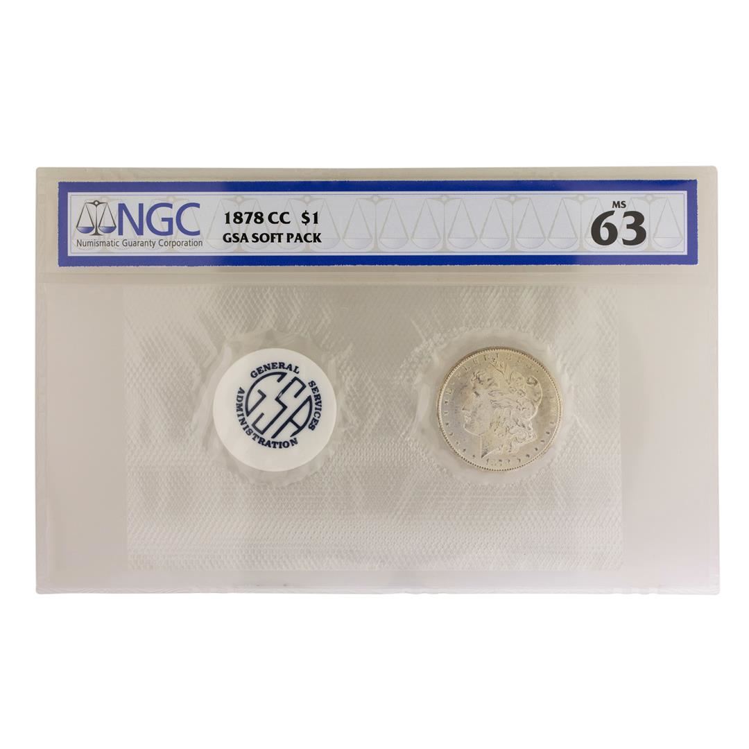 One 1878-CC $1 Morgan Silver Dollar Coin GSA Soft Pack NGC MS63. NGC Certified.
