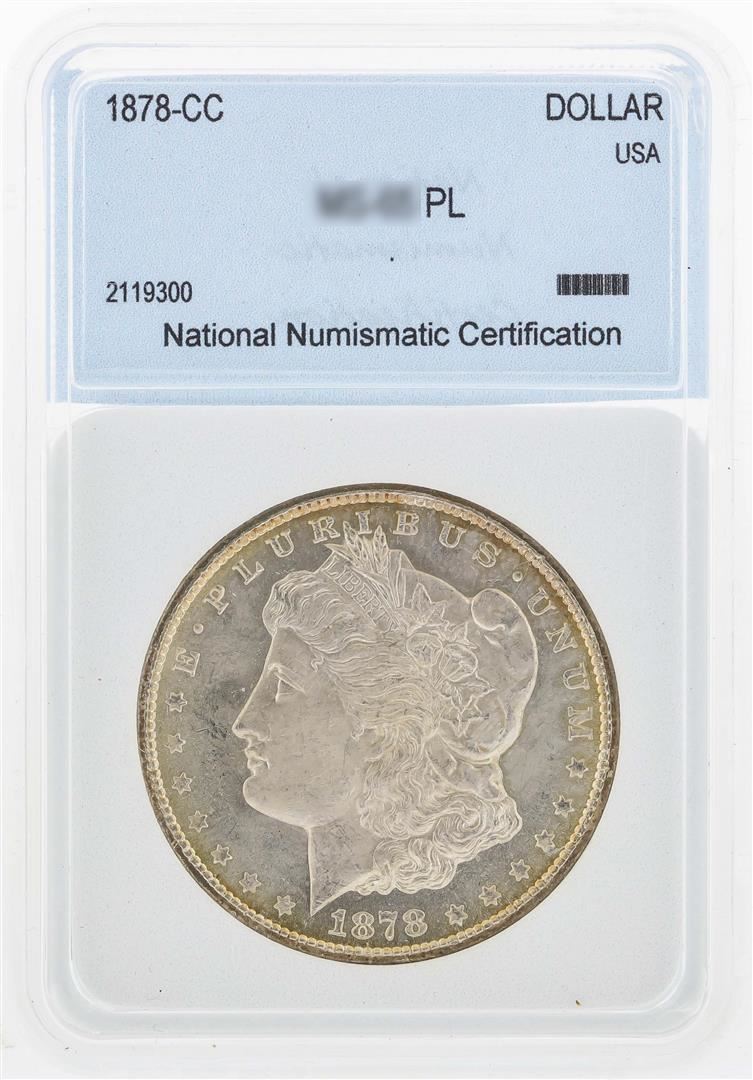 One 1878-CC $1 Morgan Silver Dollar Proof Like Coin. This coin has been graded by "National Numismatic Certification" company. However, since it is not one of the main numismatic certification companies that we currently recognize, we purposely blurred out the assigned grade of the coin to avoid any confusion. We encourage each bidder to make their own determination as to the grade & value of the coin.