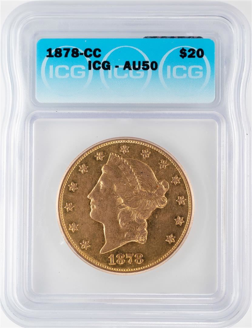 One 1878-CC $20 Liberty Head Double Eagle Gold Coin ICG AU50. ICG Certified.