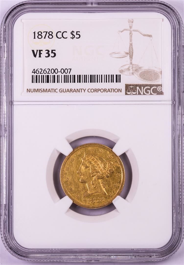 One 1878-CC $5 Liberty Head Half Eagle Gold Coin NGC VF35. NGC Certified.