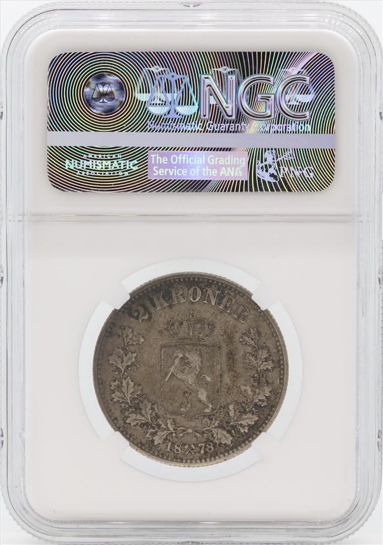 One 1878 Norway 2 Kroner Silver Coin NGC VF30. NGC Certified.