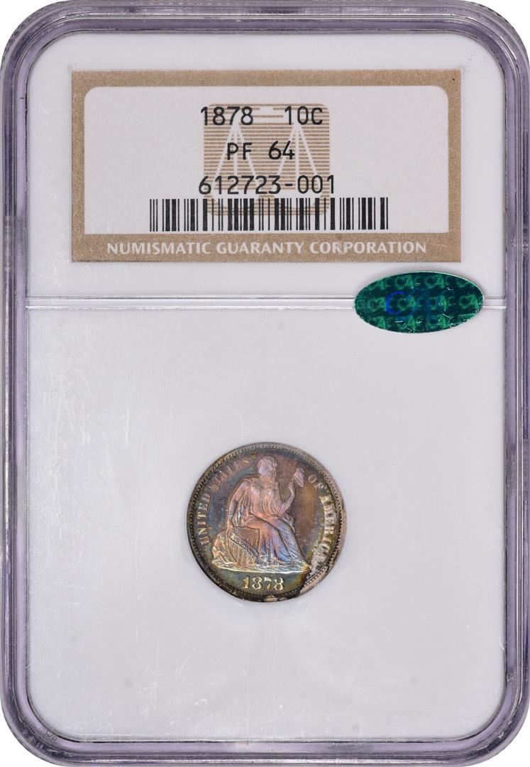 One 1878 Proof Seated Liberty Dime Coin NGC PF64 CAC Amazing Toning. NGC Certified.