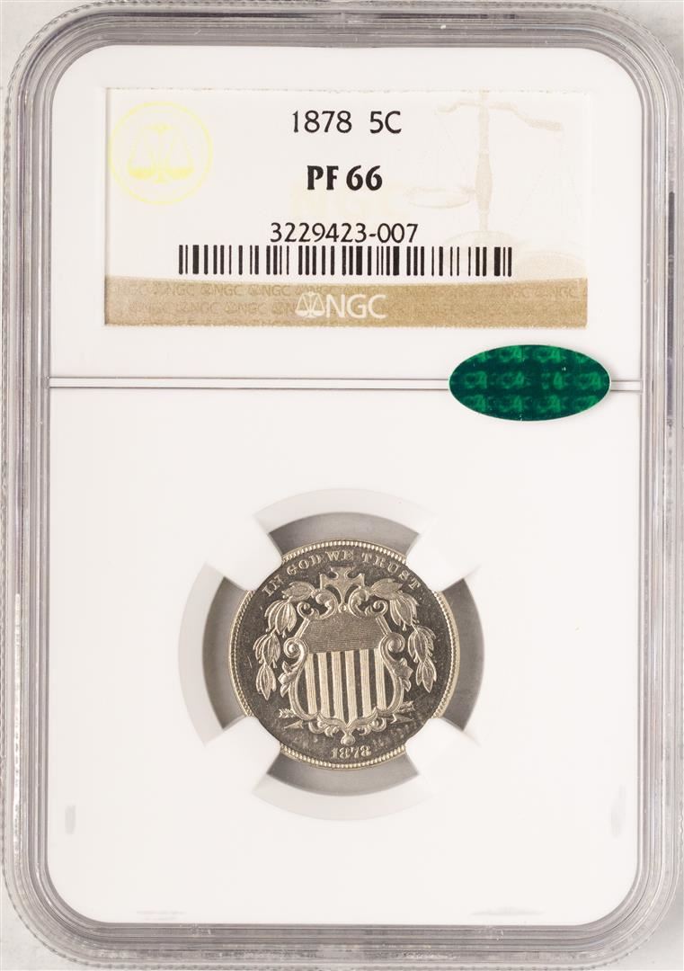 One 1878 Proof Shield Nickel Coin NGC PF66 CAC. NGC Certified.