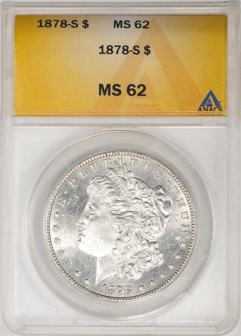 One 1878-S $1 Morgan Silver Dollar Coin ANACS MS62. ANACS Certified.
