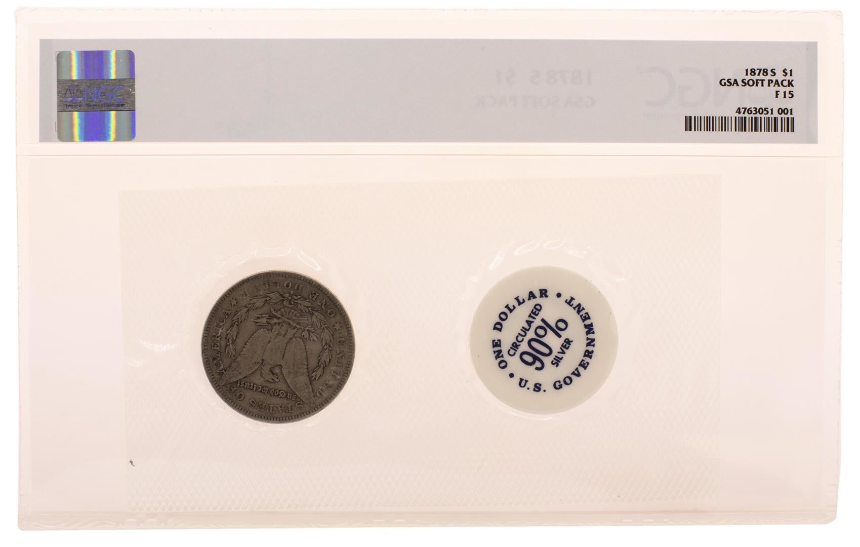 One 1878-S $1 Morgan Silver Dollar Coin GSA Soft Pack NGC F15. NGC Certified.