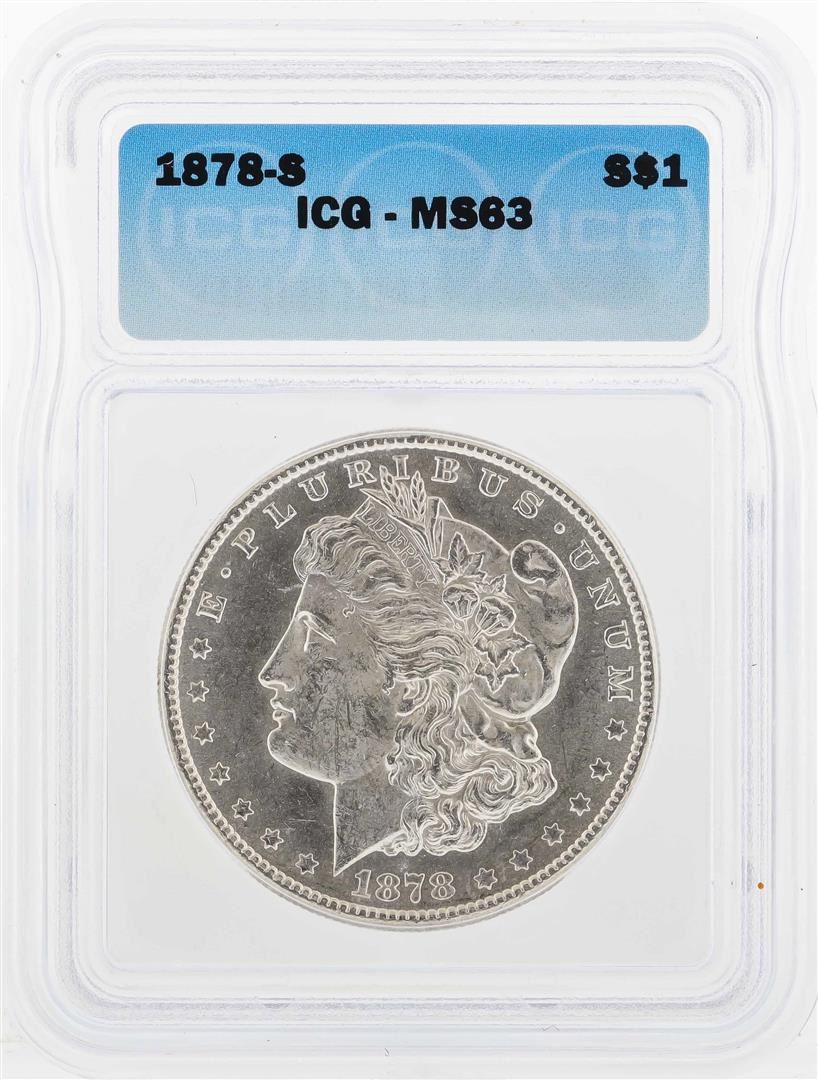 One 1878-S $1 Morgan Silver Dollar Coin ICG MS63. ICG Certified.