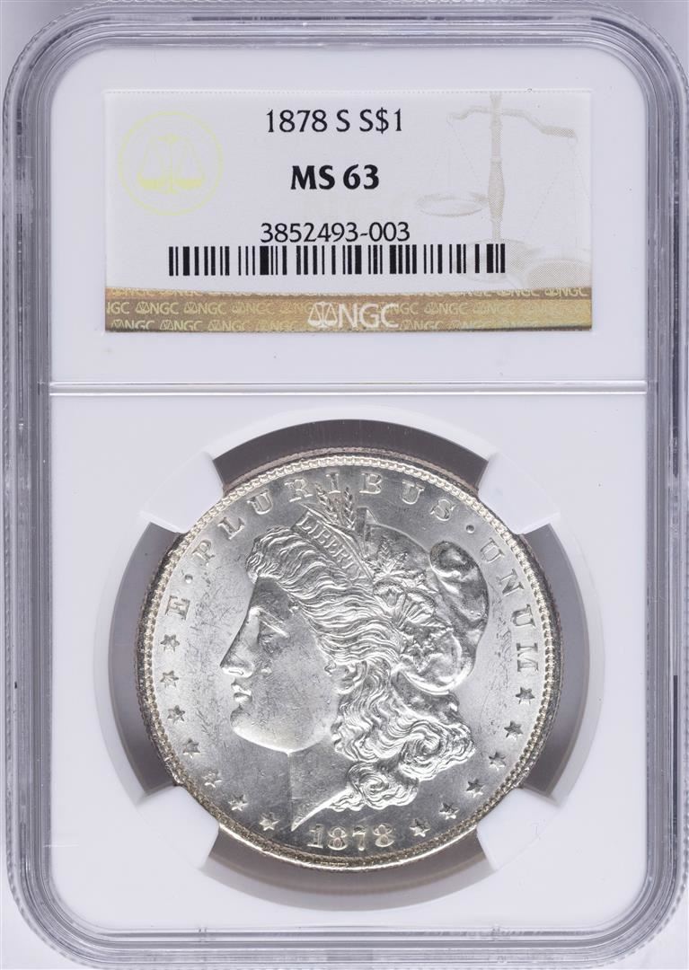 One 1878-S $1 Morgan Silver Dollar Coin NGC MS63. NGC Certified.